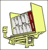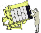By tipping the load on its side just beyond 90° and opening